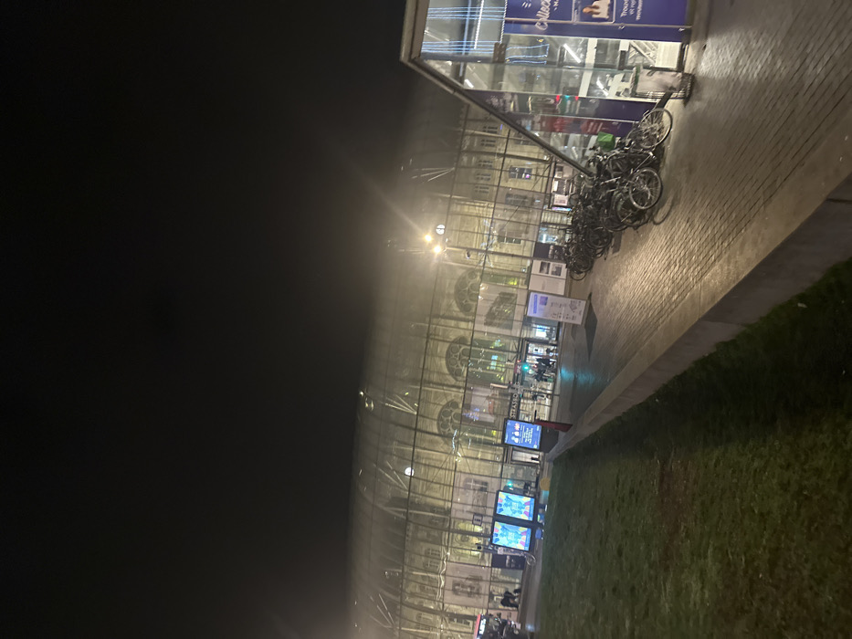 A modern glass building at night with a row of bicycles parked along its side. Digital screens display information or advertisements. The sky is dark, and the scene is lit by artificial lights. There is a patch of grass adjacent to the building, adding a touch of nature to the urban setting. The image appears to be taken from a low angle, emphasizing the height and scale of the building.