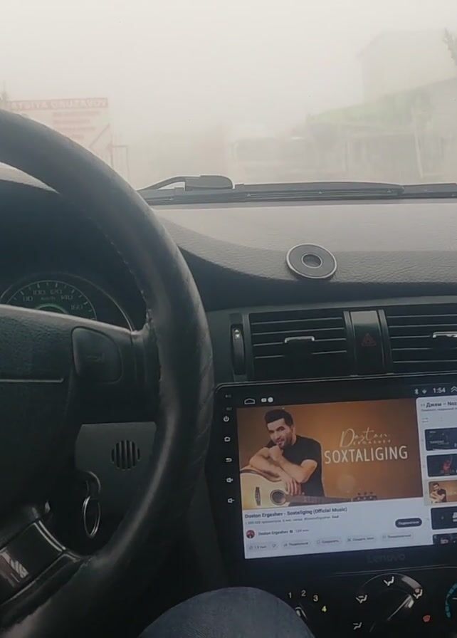 interior of a car, specifically the dashboard and steering wheel. The car is playing music on a digital display. Outside the car, the weather is foggy, with reduced visibility. Heavy machinery, possibly cranes, is visible in the background through the windshield. The steering wheel has a Chevrolet logo.