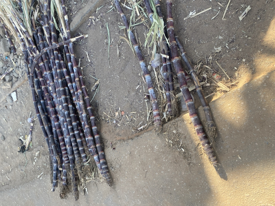 The scene in Kaduna South, Nigeria, shows an outdoor ground-level view dominated by numerous harvested sugarcane stalks