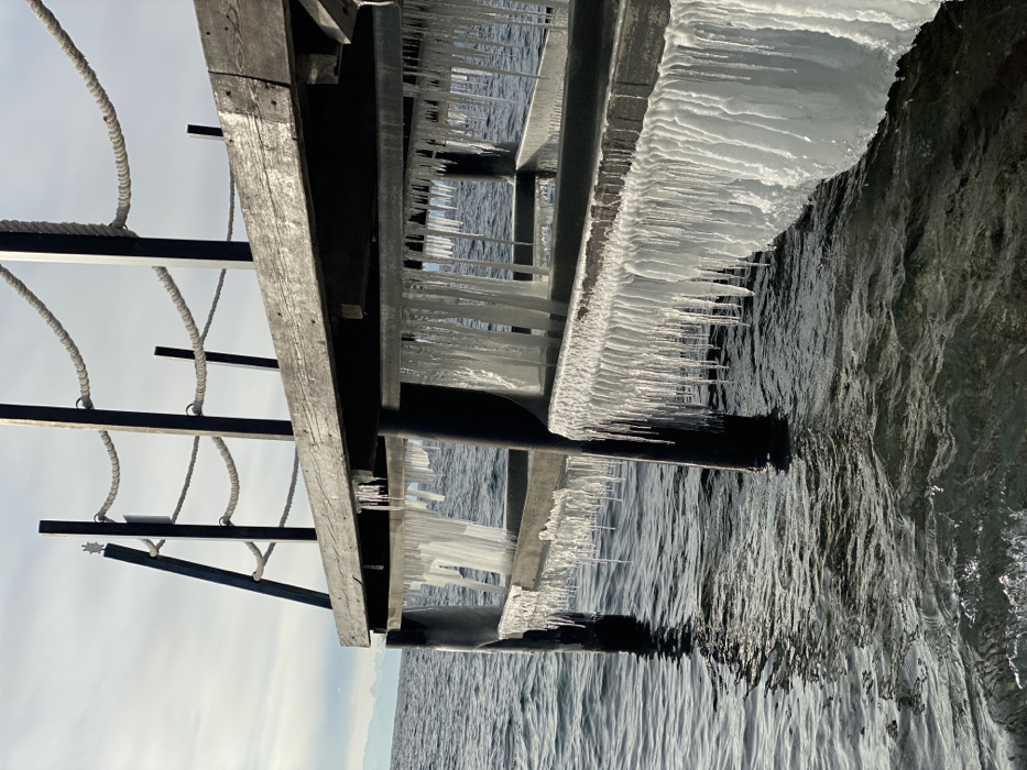 pier extending over water. Icicles hang from the underside of the pier, some reaching almost to the water's surface. The pier is constructed of dark wood and metal supports. Ropes are also attached to the pier structure. The water is choppy, reflecting the sky. The sky is pale with a few clouds.