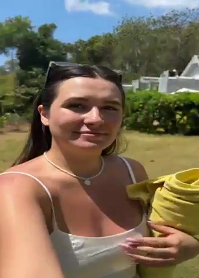 A woman is standing on a grassy lawn with a view of the ocean. She is fair-skinned with long dark hair, and she is wearing a white tank top and a pearl necklace. She is holding a folded yellow towel in her left hand. She looks at the camera, then looks to her right at the ocean, then looks back at the camera. The sky is blue, and there are green trees in the background.