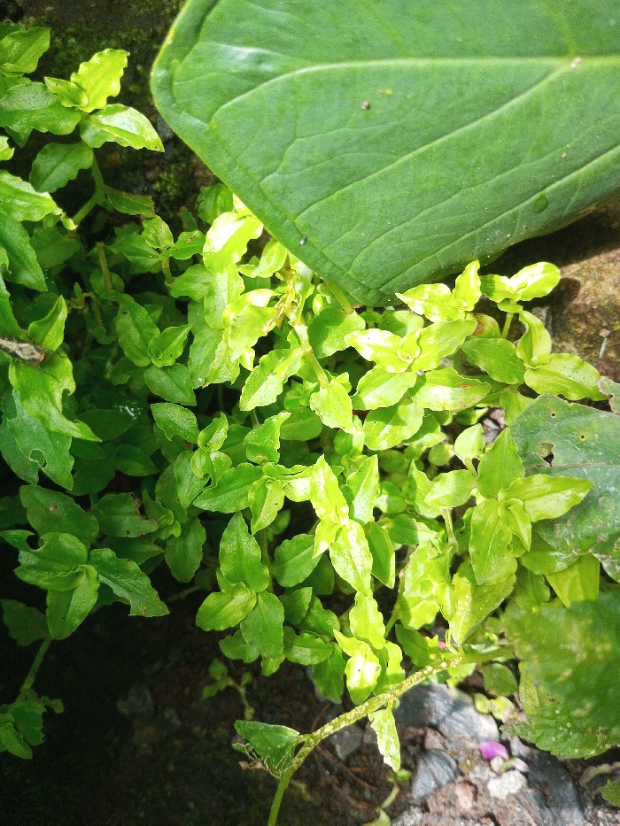 The image, taken in Mindat, Myanmar, presents a ground-level, close-up view of dense vegetation. A substantial cluster of small-leafed green plants, ranging in color from vibrant lime green to a darker emerald, occupies the majority of the frame, particularly the lower and left sections. Many of these leaves display irregular edges and minor insect damage, characterized by small holes or chewed margins. In the upper right quadrant, a large, dark green leaf with prominent parallel venation is visible, partially overlying and obscuring the smaller plants beneath it. The underlying substrate consists of dark, moist soil with scattered small, dark, angular fragments, likely stones, and a few minute purplish specks of organic debris towards the lower right. The scene is illuminated by natural light, creating bright highlights on the lighter green foliage. No human or animal subjects, actions, or interactions are present.