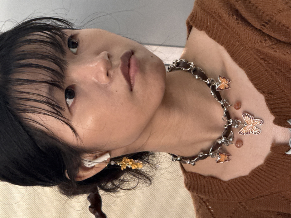 A close-up portrait features an individual, identified as female, with dark hair styled with bangs, looking towards the right side of the frame with a neutral expression. The subject wears a brown knitted top. In the right ear (viewer's left), a white wireless earbud is visible along with a dangling earring composed of multiple small yellow floral or leaf-like elements and clear beads. A choker-style necklace is worn, consisting of a dark brown band interwoven with silver-toned chain links or decorative elements. Suspended from the necklace are three butterfly charms, detailed in orange and silver, and two smaller spherical, amber-colored beads. The background is an indistinct indoor setting, with a light brown textured surface on the left and a lighter, plain surface on the right. There is no visual information within the image to determine a specific geographic location such as Yuzhong District, China.
