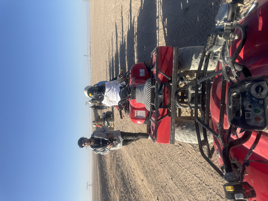The scene depicts a group of individuals paused in a desert landscape outside Hurghada, Egypt. The vantage point is from the seat of a red quad bike (ATV), facing forward. In the immediate foreground, the dusty black handlebars and dashboard controls of the red quad bike are visible. Directly in front, another red quad bike is stationary, displaying a black and white checkered seat cover, a rear cargo rack, and two large, treaded rear tires. Warning labels are visible on the left side panel of this ATV. A person is seated on this quad bike, facing away from the camera, wearing a white helmet with a yellow stripe and a white cloth or garment draped over their shoulders and back, over a light blue top. To the left of the stationary quad bikes, a male individual with dark, curly hair and a beard is walking towards the viewer. He wears a light grey long-sleeved shirt, dark pants, and white sneakers. A black camera with a strap is held in his hands and around his neck, and he appears to be looking towards the camera's position. Further in the midground and background, a line of additional red quad bikes, each with a helmeted rider, extends into the distance, suggesting a tour or group activity. The riders are equipped with helmets and some appear to be wearing goggles. The environment is a vast, arid desert with light brown, sandy ground showing multiple tire tracks. The sky above is clear and bright blue, devoid of clouds. On the distant horizon, several tall metal power line towers are visible, extending across the flat landscape.