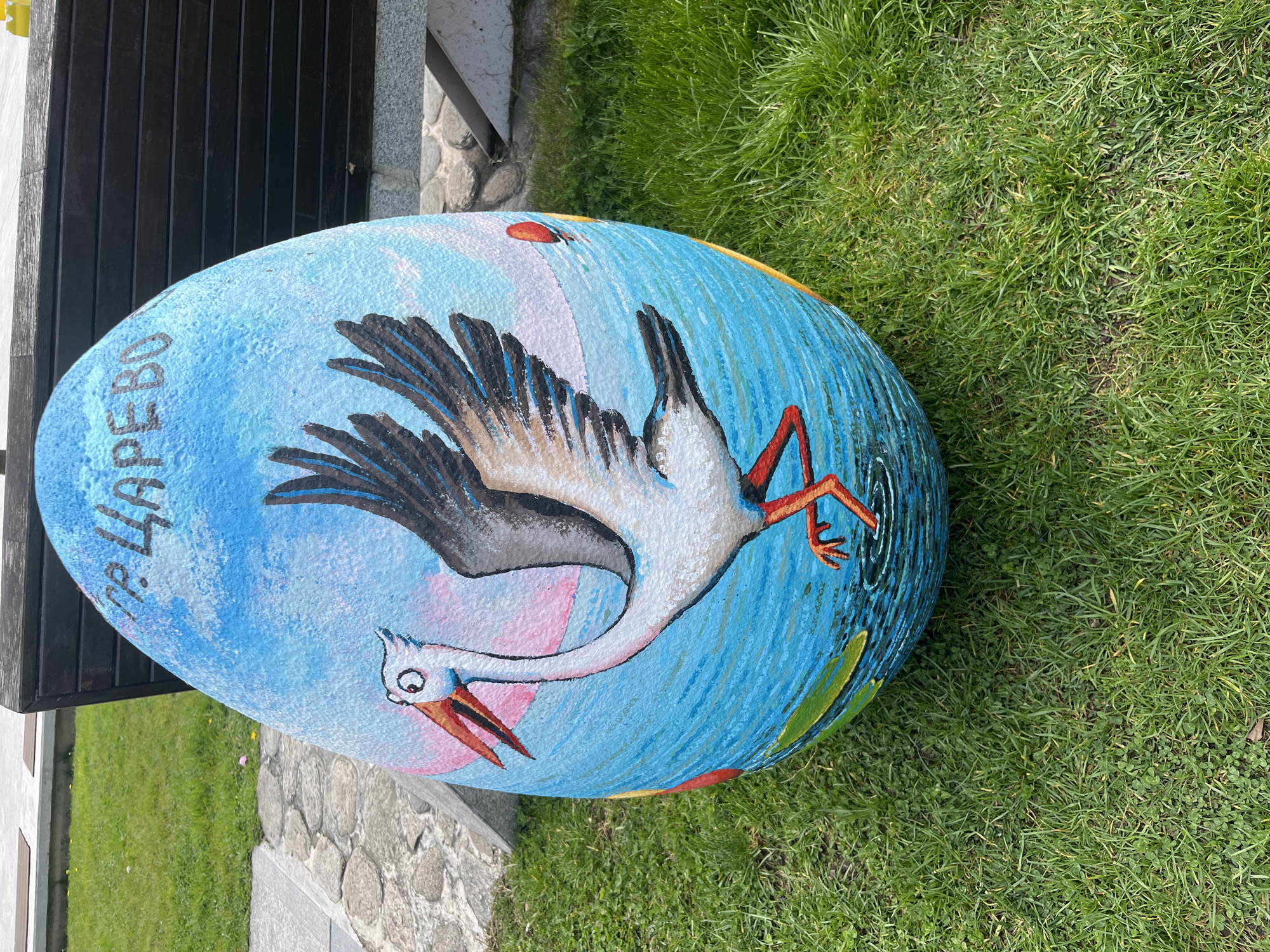 - "large, painted stone egg depicting a stork hunting in water" by FM-XwS7W2, licensed under CC BY 4.0