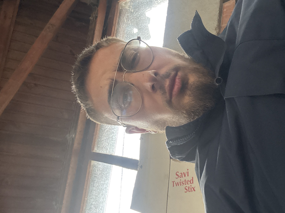 A male individual, approximately 20-35 years old, is depicted in a close-up portrait, gazing directly forward. He has short, light brown hair and a light brown full beard. He wears silver-framed aviator-style prescription glasses, and a small hoop earring is visible in his left ear. The individual is wearing a dark blue jacket with a visible zipper pull on the collar. The background indicates an indoor setting. Above the subject's head is a wooden ceiling constructed with exposed planks and beams. To the subject's left and right are large window panes, with light visible through them, suggesting an exterior light source. To the subject's left (viewer's right) is a light-colored vertical panel or box with red text printed vertically. The text reads "Savi" on the top line and "Twisted Stix" on the line below. The presence of the "Savi Twisted Stix" product label, associated with Savi, a food production company headquartered in Haskovo, Bulgaria, indicates the scene is located within a facility or premises belonging to Savi in the city of Haskovo, Bulgaria. The overall environment, with the wooden ceiling and window structures, suggests a workshop, storage area, or production facility.