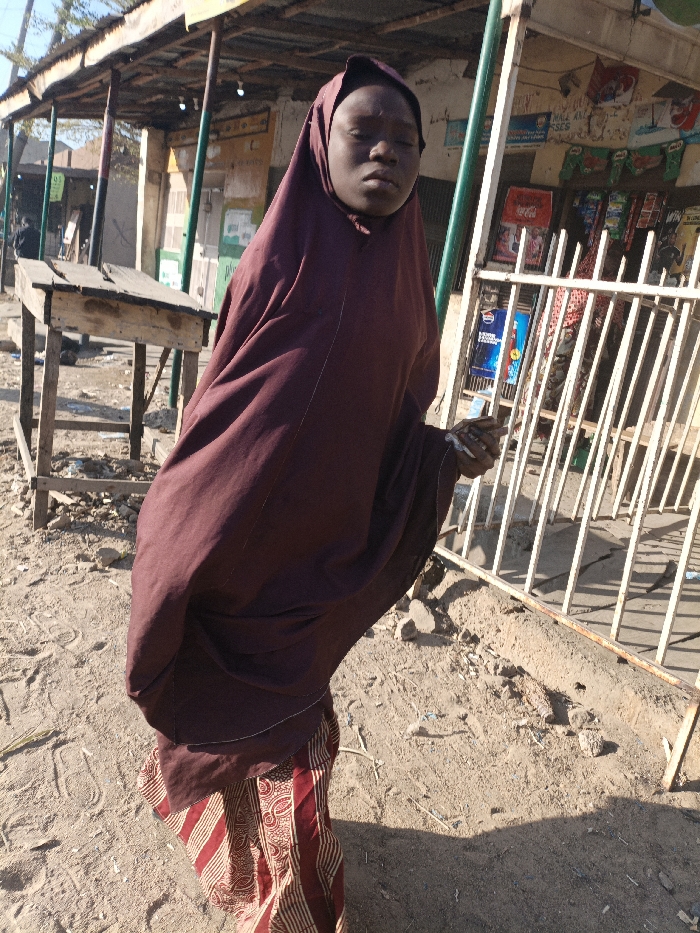 A young woman in a maroon hijab stands outdoors on a dusty, uneven ground. Her attire consists of a long, loose-fitting robe paired with a patterned skirt featuring red stripes. Behind her, a weathered building with a corrugated metal roof and a metal fence frame a scene suggestive of a modest, perhaps rural, setting. Visible signage and merchandise hint at a small retail business or market stall.
