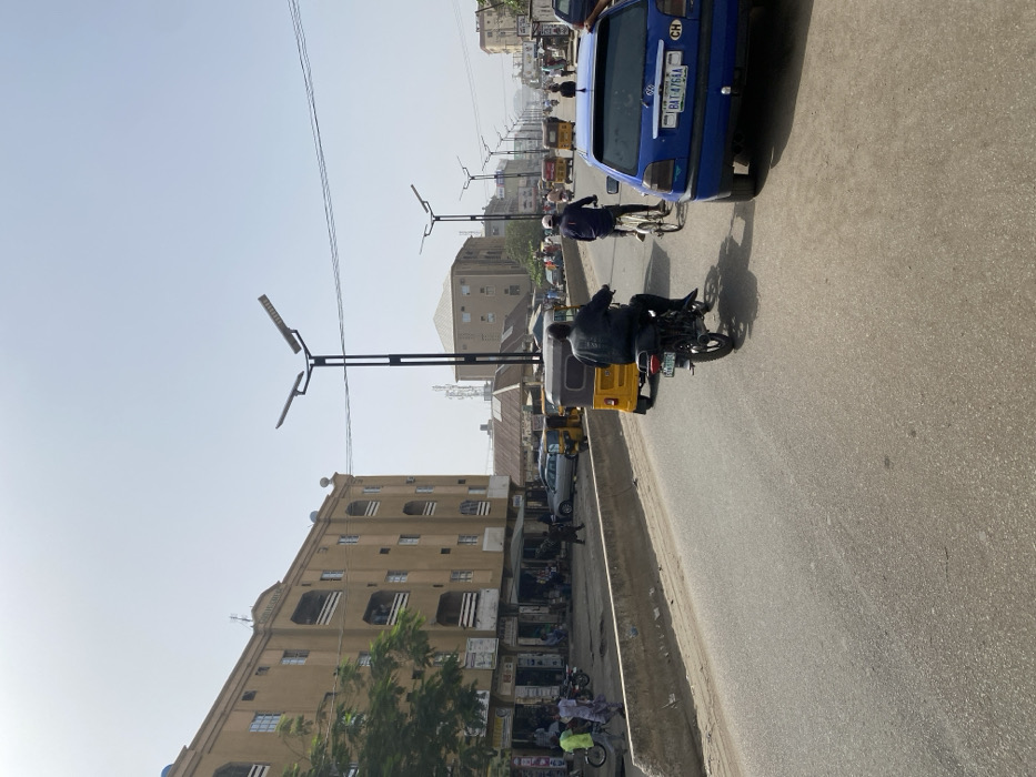 This image depicts a busy urban street scene in Sabon Gari East, Nigeria, observed on a clear, sunny day. The foreground shows a multi-lane asphalt road. On the right, a blue Volkswagen Golf hatchback (license plate "BAT 476AA") is stationary or moving slowly. Ahead of it, a male individual rides a bicycle. In the central lane, another male operates a black motorcycle, followed by a yellow motorized tricycle (keke napep). Shadows from vehicles and individuals are cast on the road surface, indicating overhead sunlight. To the left of the roadway, a low concrete barrier separates traffic from a parallel unpaved area. Beyond this barrier, a tan, four-story building with multiple windows and balconies dominates the left midground. Its ground floor houses several commercial establishments with open storefronts, where numerous pedestrians are visible, some standing, some walking. Several parked vehicles, including cars and more tricycles, are visible near these shops. Green tree foliage partially obscures the leftmost portion of the main building. Extending into the background, multiple black streetlights with dual solar panels/LED fixtures line the street, indicating a well-lit thoroughfare. Further down the road, additional vehicles, including more tricycles and cars, are present, suggesting continuous traffic flow. Various other buildings, some with corrugated metal roofs, are visible in the background under a light blue, hazy sky. Overhead electrical or communication lines traverse the scene.