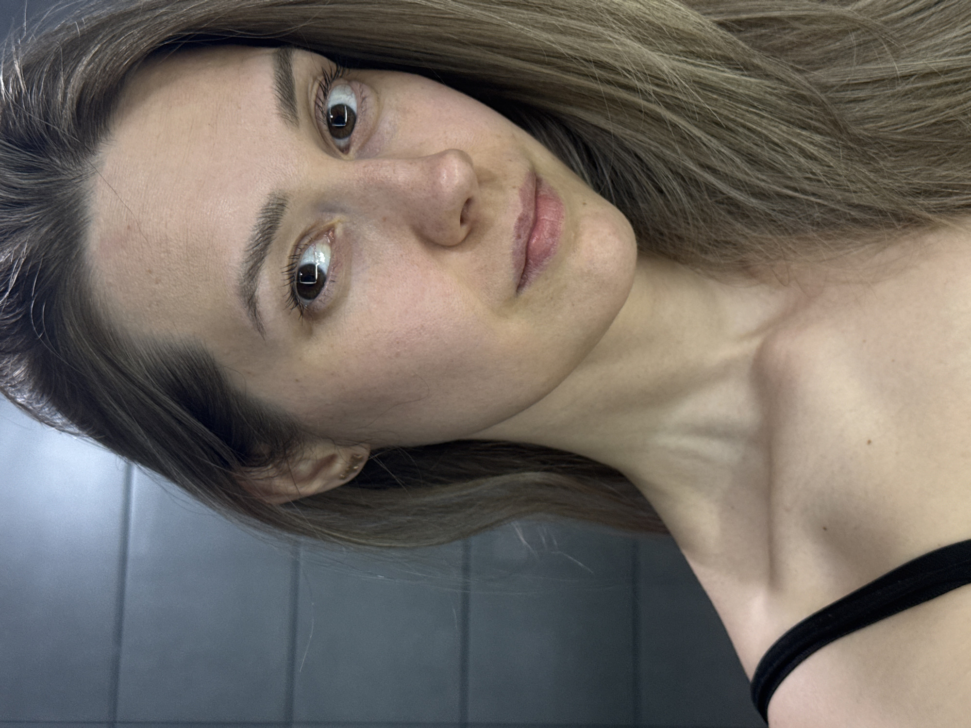 A woman with light brown hair and fair skin poses for a photograph. She is wearing a black strap, possibly part of a tank top or dress. Her hair is styled casually around her face. The background appears to be a gray tiled wall. There is no verifiable evidence to confirm the location as Chaikovsky, Russia, without additional information.