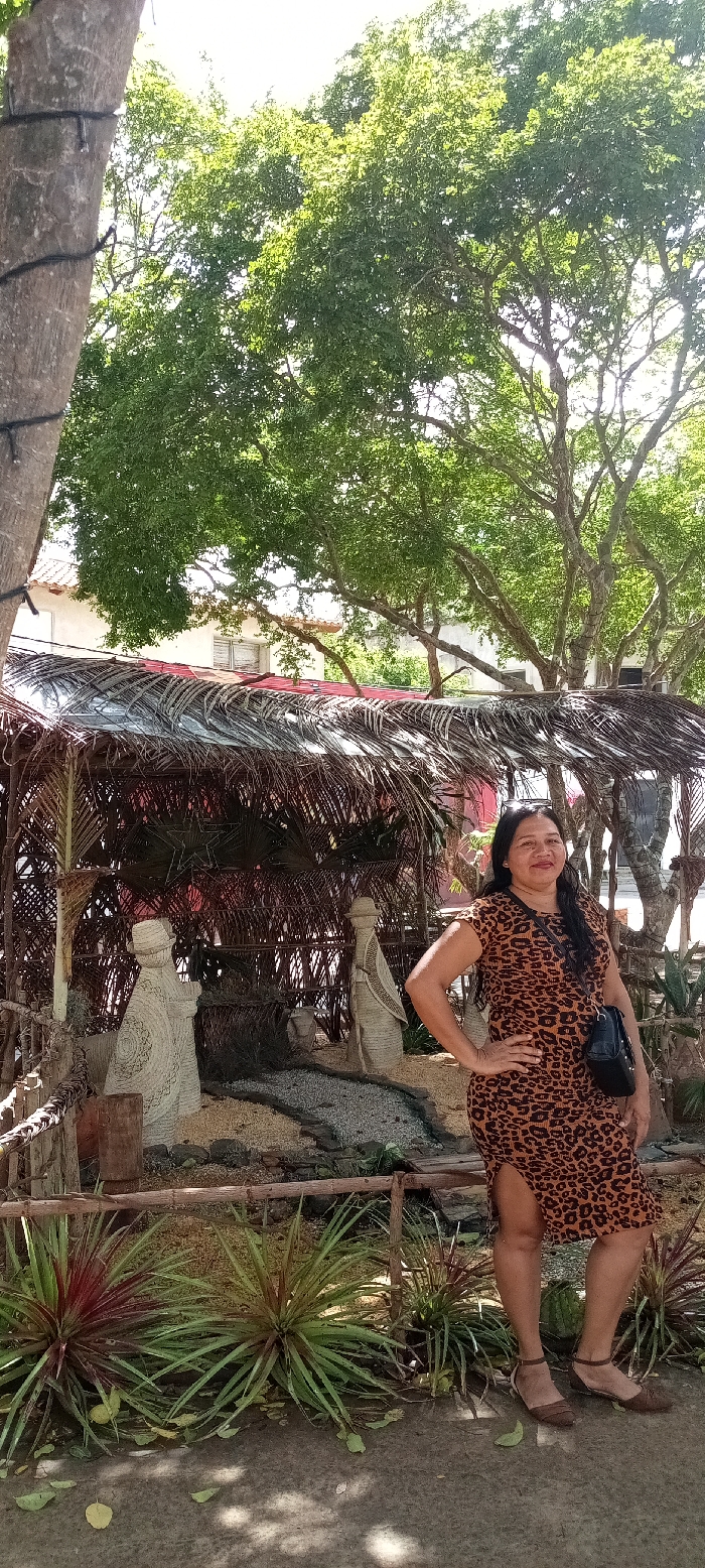 An adult female is standing outdoors, posing for a photograph in what appears to be a public park or garden in La Asunción, Venezuela. She is positioned slightly to the right of the frame's center, facing the camera with a subtle smile. The woman has long, dark hair and is wearing a short-sleeved, calf-length dress with an orange and black leopard print pattern, featuring a slit on the left side. She wears dark brown flat shoes with ankle straps and a small black handbag with a shoulder strap hangs at her right side; sunglasses are perched on her head. Her right hand is placed on her hip. Behind her, to the left, is a rustic display resembling a nativity scene or "pesebre," constructed under a shelter of dried palm fronds. Inside, two stylized, light-colored figures, possibly woven from straw or similar material, stand on a bed of light-colored gravel. A winding path of darker stones leads between them. A woven star decoration is visible on the back wall of the shelter, which is also made of palm fronds. In the immediate foreground, a low, rustic wooden fence separates the viewer from a planting bed containing several spiky, green and reddish-green bromeliad-like plants. The ground is paved, with some fallen leaves visible. The background features lush green foliage from large trees, their branches reaching towards a bright sky. A light-colored building with a reddish-orange tiled roof and a window with closed shutters is partially visible behind the trees and display. A tree trunk wrapped with dark wires is present on the far left. The scene is brightly lit, suggesting daylight.