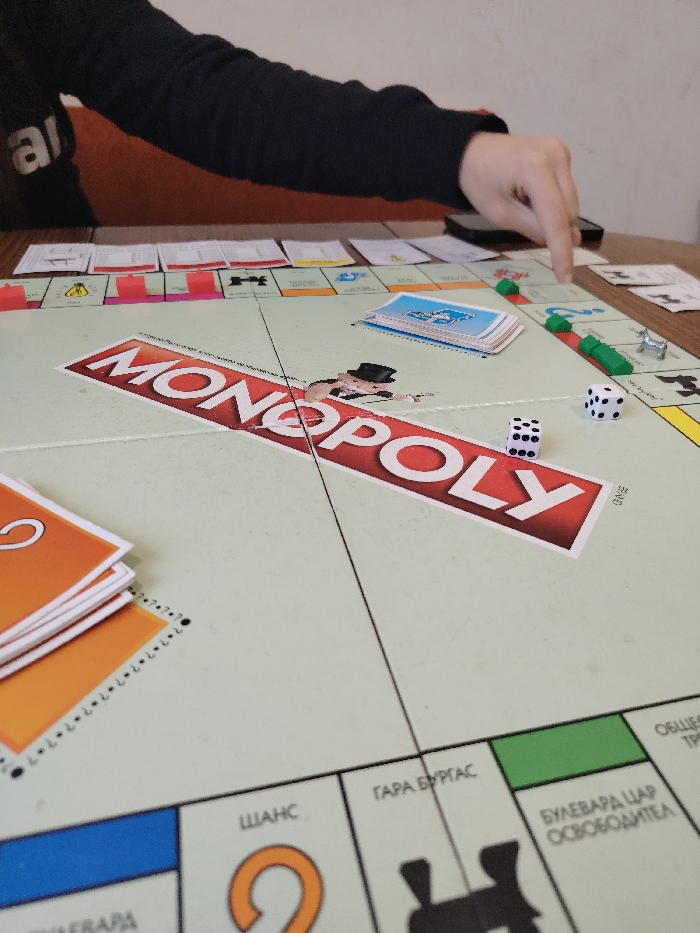 The scene depicts an indoor setting in Izvor, Bulgaria, centered on a game of Monopoly in progress