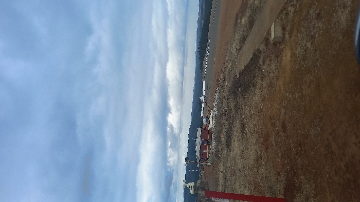 An overcast sky looms above a landscape. The ground is mostly brown, with patches of dark and light areas. A building stands in the middle ground, its red roof contrasting with the surrounding earth tones. A road runs along the edge of the landscape, lined with parked vehicles. The image is oriented in such a way that the sky appears to be on the left side.