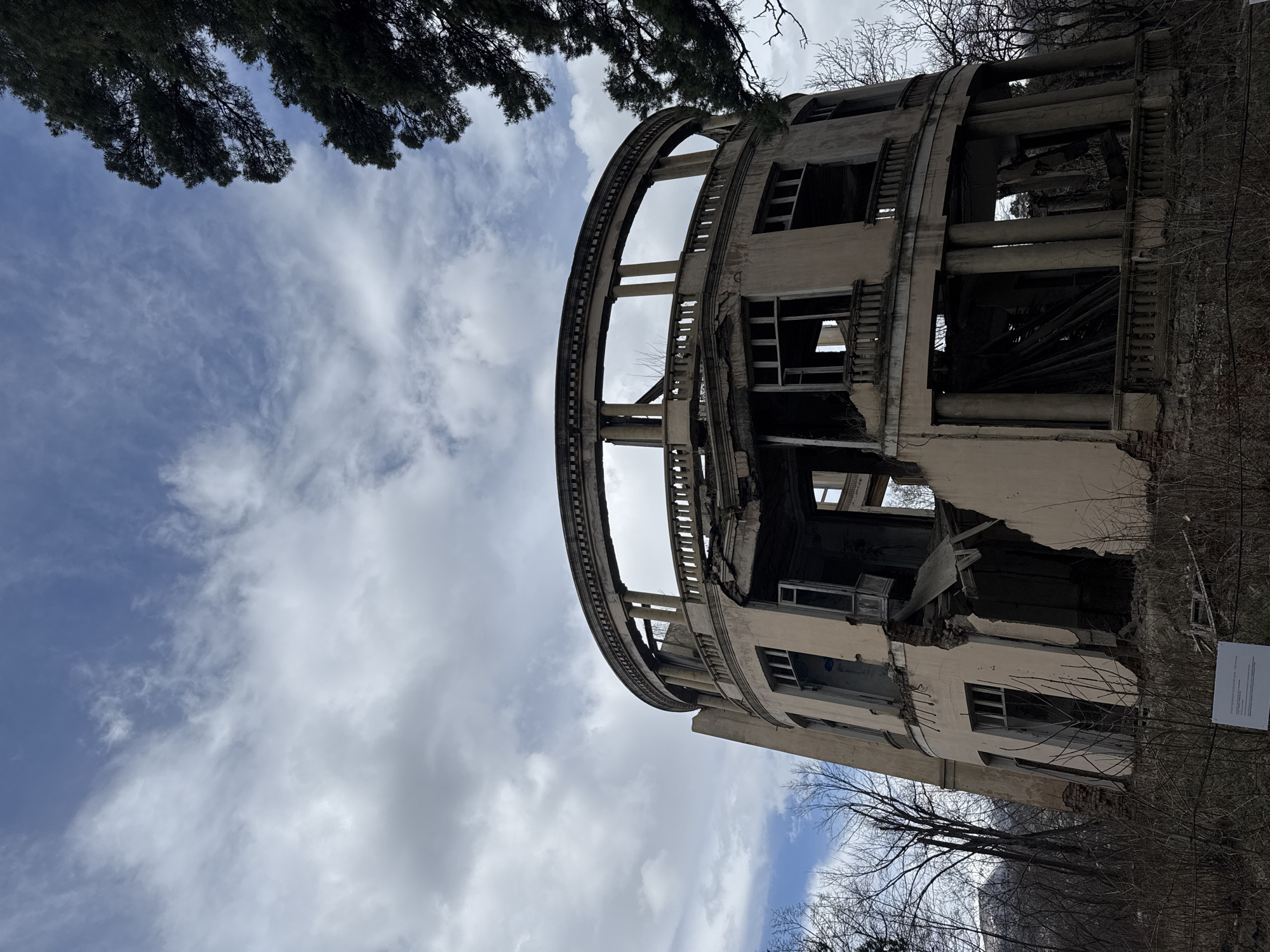 n abandoned, decaying cylindrical building, possibly a former hotel or sanatorium, in Dilijan, Armenia. The structure is three stories tall with a circular balcony on the top floor. The building is in a state of disrepair, with broken windows, crumbling walls, and exposed interior elements. The sky is visible through the gutted building. The surrounding environment includes trees, some bare, and a partially visible sign. The building is viewed from a low angle, tilted upward.
