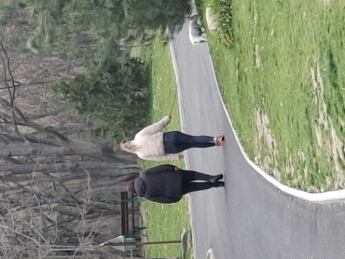 The image presents an outdoor scene within a public park in Plovdiv, Bulgaria. Two individuals are observed from behind, walking on a dark grey asphalt path that curves gently to the right. The path is bordered by a light-colored curb separating it from a grassy area. The individual on the left wears a dark hooded jacket, dark trousers, and dark shoes. The individual on the right, with blonde hair, wears a light-colored puffer jacket, dark blue fitted trousers, and light-colored athletic shoes. This individual holds a thin, flexible leash in their right hand, which extends towards a small, light-grey quadrupedal animal, consistent with a dog, located on the green grass to the right of the path. The animal is facing right, appearing to sniff the ground. The environment includes mature deciduous trees with bare branches dominating the background, suggesting a winter or early spring season. Several evergreen bushes are visible in the mid-ground, particularly to the right of the path. A dark wooden park bench with a metal frame is situated on the grass in the far left background. The ground is predominantly covered in green grass, with some drier patches visible. The scene is illuminated by diffuse, even lighting, indicative of an overcast sky.
