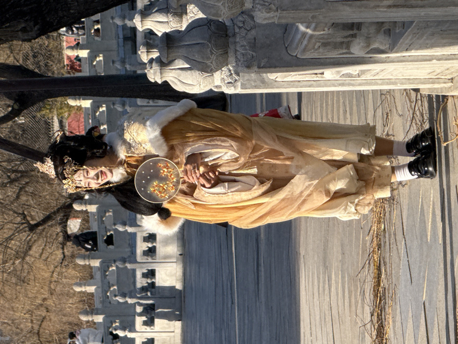 A person dressed in a traditional gold and white outfit with fur trim stands on a bridge. They wear a decorative headpiece and hold a round fan with floral details. The bridge has intricate stone carvings along the sides. The person wears black shoes and white socks, adding a modern twist to the historical attire. The background shows a blurred landscape with trees and other structures.