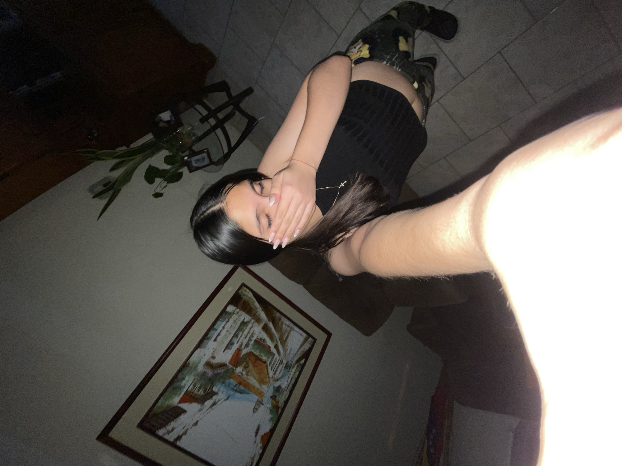 A woman is lying on her back on a tiled floor indoors. She is wearing a black top and camouflage pants. Her hands are covering her mouth. A framed picture hangs on the wall behind her. There is a wooden table and a plant in the background. The location cannot be determined from the image.