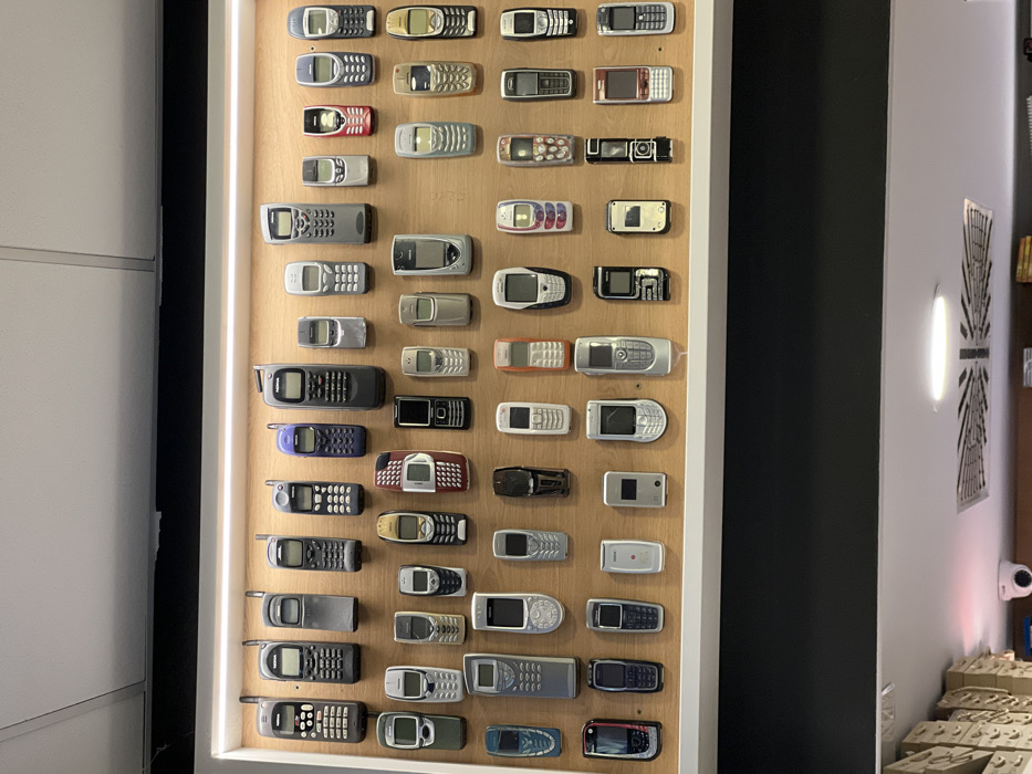 - "The image displays a collection of 71 mobile phones mounted for exhibition on a light wooden panel" by FM-9WVys2, licensed under CC BY 4.0