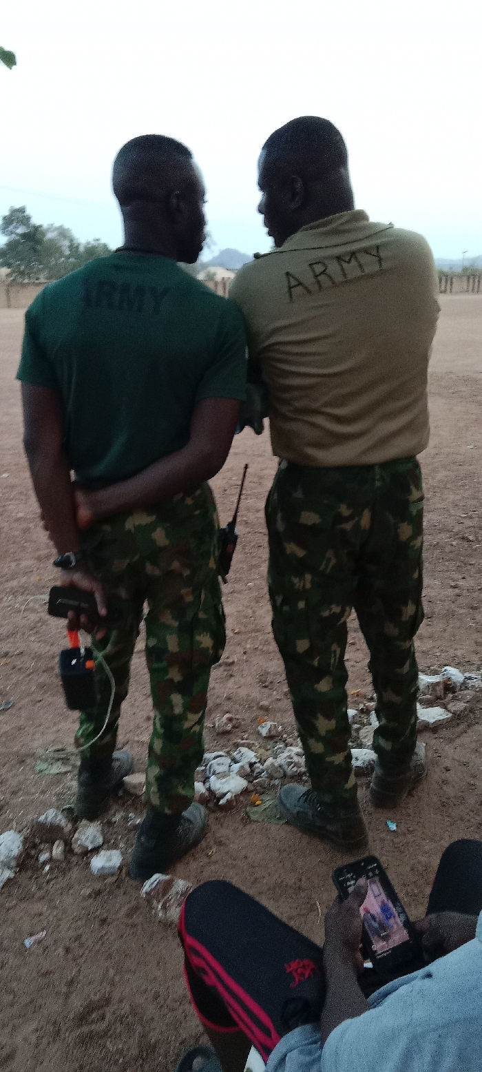 Two African soldiers in camouflage pants and "ARMY" labeled shirts stand facing each other outdoors. The soldier on the left wears a dark green shirt, while the other wears a tan shirt. One soldier holds a device with wires. A third person is partially visible at the bottom, looking at a phone screen. The background shows a dusty landscape.