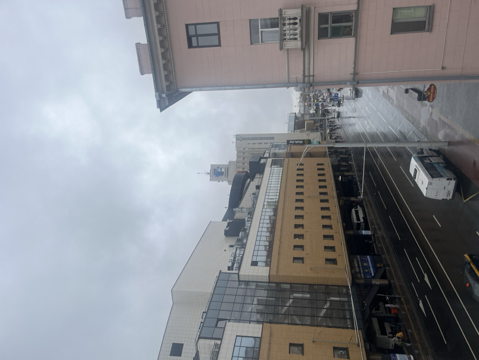 This image presents an elevated, oblique view of a city street in Minsk, Belarus, on an overcast day, with evidence of wet road surfaces