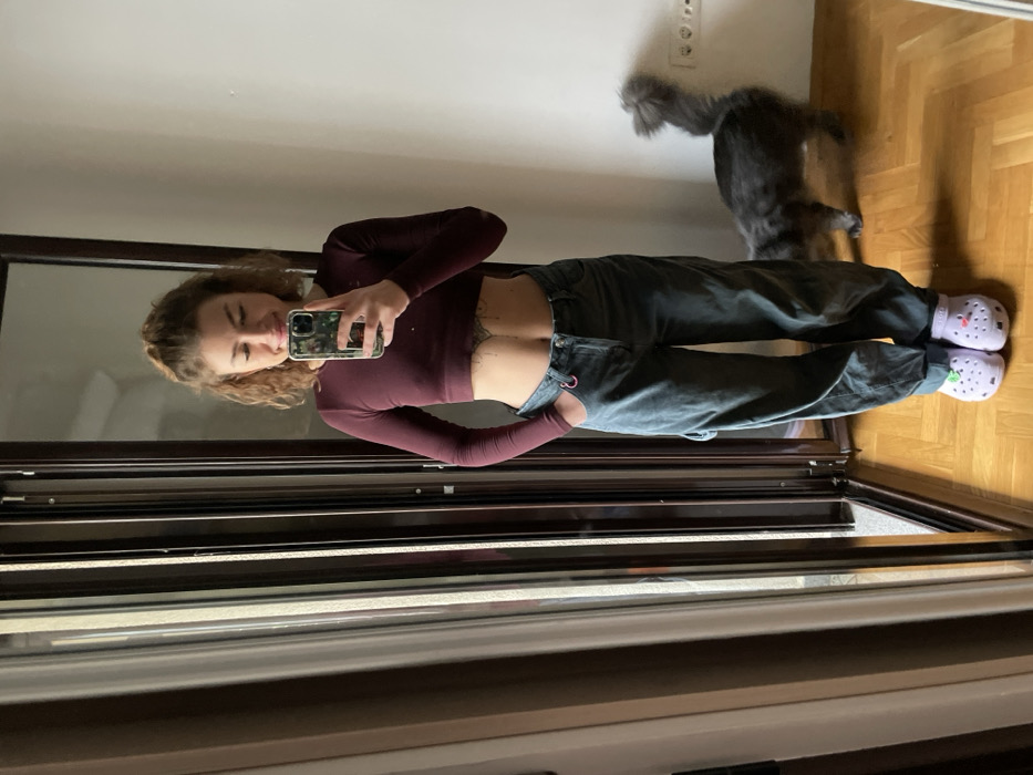 A young woman is depicted in an indoor setting, taking a mirror selfie in Boreti, Montenegro. She stands facing forward, smiling, with her curly light brown hair partially pulled back. She wears a long-sleeved maroon crop top, revealing her midriff and a visible tattoo below her navel. Her lower attire consists of loose-fitting dark grey pants, with a pink carabiner-style clip attached to the front left belt loop. She has light purple Crocs with green decorative charms on her feet. Her right hand holds a smartphone with a floral-patterned case, directed towards the reflective surface for the photograph. Her left hand is placed in her left pant pocket. To the woman's right, a long-haired grey cat with an erect, fluffy tail stands on the light brown parquet floor, facing left and appearing slightly blurred. The background features a white wall with a visible electrical outlet to the right, and a tall, multi-paneled dark brown window or door frame unit to the left, which creates reflections.