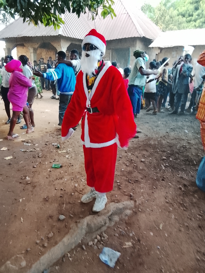 A person in a Santa Claus costume stands in a dirt clearing surrounded by people