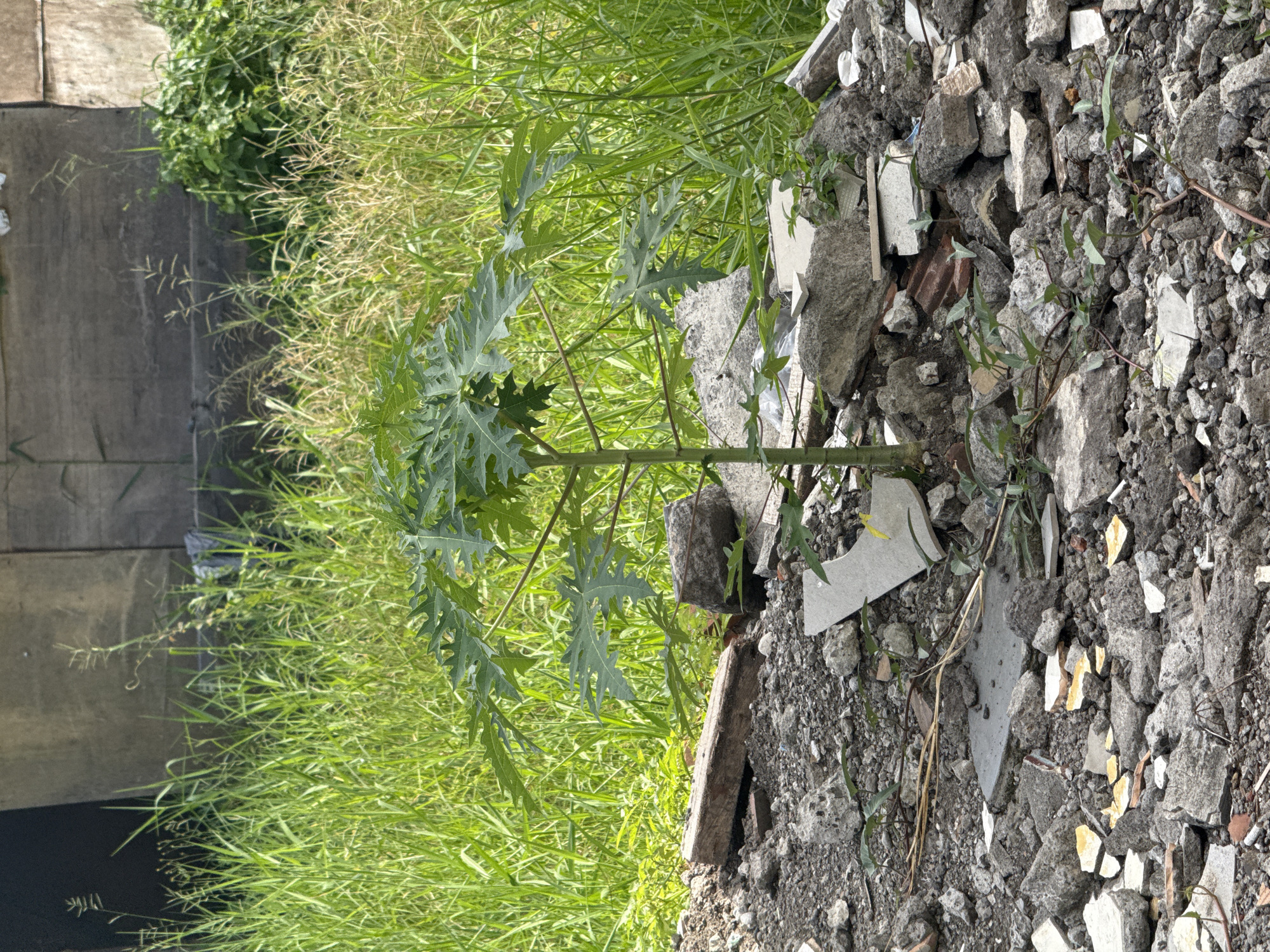 A small, green papaya plant grows amidst a pile of construction debris and gravel