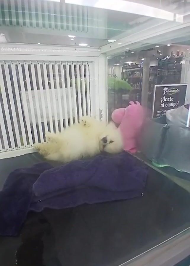 The video depicts a white dog lying on its back on a dark surface. A dark purple towel is draped beneath the dog. The dog is next to a pink stuffed animal. The dog appears to be in some sort of enclosure, as there are white bars along the wall. A sign, which is partly blocked, is visible, and the rest of the scene looks to be in a store.