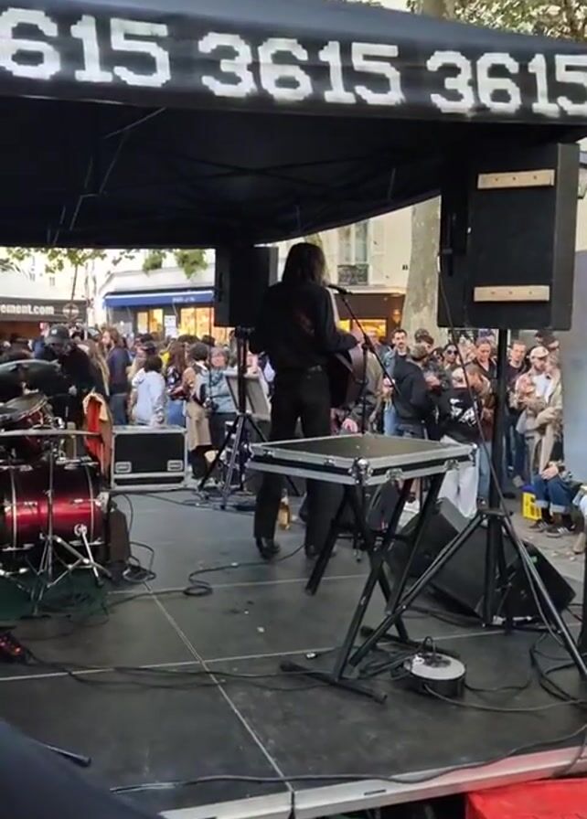 band performing on a temporary stage set up outdoors. The band consists of a drummer, a guitarist and possibly other musicians obscured from view. They are performing under a black canopy with the number "3615 3615 3615" printed on the front. The guitarist, dressed in black, is positioned at the center of the stage. A crowd of people stands watching the performance, most of whom appear to be holding phones to record. Beyond the crowd is a street with shops and buildings. The lighting indicates it is likely daytime.