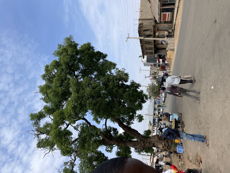 The image presents a street scene in Jos, Nigeria, under a sky with scattered white clouds. A large, mature tree with dense green foliage and a substantial, gnarled trunk occupies the left side of the frame, extending upwards and across the top. A partial view of a person's head is visible in the extreme lower-left corner. Beneath the tree, on an unpaved area, several individuals are present. One man, dressed in a blue denim shirt and jeans, stands with his hands on his hips, facing towards the right. A vendor's cart containing items, possibly produce, and blue plastic containers on the ground are positioned nearby. A paved road, appearing to be a two-lane thoroughfare, traverses the mid-ground from the right foreground towards the distant left. Two men are walking away from the viewer on the right side of this road; one carries a dark, possibly soft, object on his head and a bag in his hand. Other pedestrians are visible further down the street. Vehicles, including cars, are parked or in motion in the background on the left side of the road. On the right side of the street, a multi-story building under construction is prominent, characterized by unfinished block walls and an extensive wooden scaffolding system. Construction materials, including a pile of sand and a concrete mixer, are located at the base of this structure. Adjacent to it is a single-story building with a reddish-brown corrugated roof and a wall partially painted in red. Various other commercial and residential buildings with different facades line both sides of the street in the background. Multiple utility poles with overhead wires are visible throughout the scene. The entire area is illuminated by natural daylight.