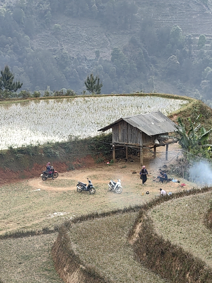 The scene depicts a rural, terraced landscape in Mù Cang Chải, Vietnam. A weathered wooden stilt hut with a corrugated metal roof stands in the mid-ground. To the left of the hut, a dirt path curves, on which a person wearing a colorful head covering is riding a dark red scooter. Two other scooters, one black and one white, are parked on the dirt ground near the hut. One individual stands near the hut, dressed in dark clothing and a colorful head covering. To the right of the hut, three to four individuals are seated on the ground, and a plume of white-grey smoke rises from a small fire beside them. Further down to the right, another person is bent over in a sparsely vegetated lower terrace. A large, water-filled rice paddy with young green sprouts occupies the mid-left and center, bordered by a dirt embankment. Beyond the paddies, hazy, forested mountains rise steeply.