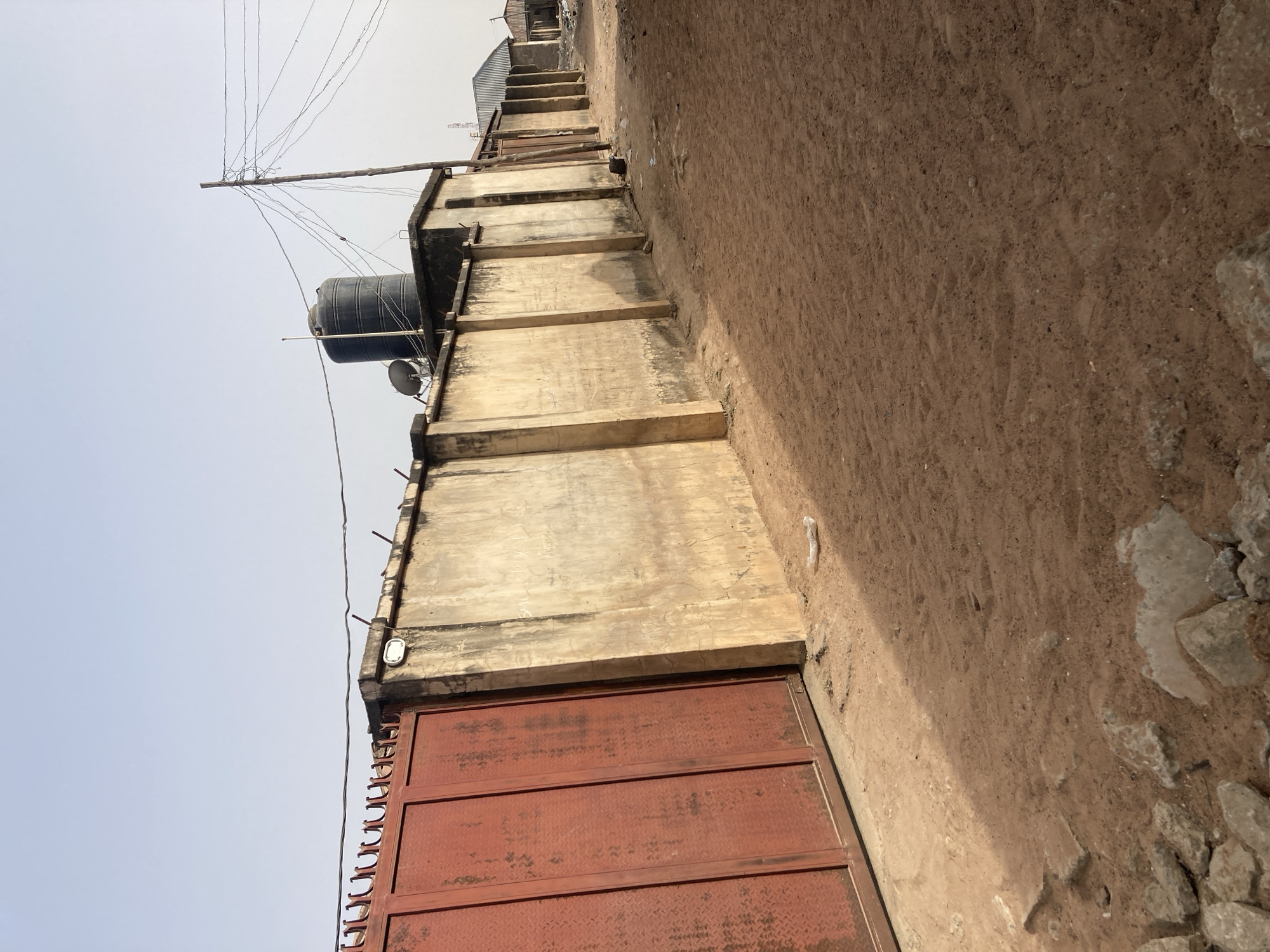 The image depicts a narrow passage between a tall, multi-story building and a dirt embankment. The building is constructed of concrete and features horizontal ledges along its facade. A rusty red metal gate or door is at the base of the building. On top of the building, a black water tank and a satellite dish are visible. Power lines stretch across the sky above the building. The dirt embankment is textured and appears dry. The image may be taken in Minna, Nigeria. No people are visible.