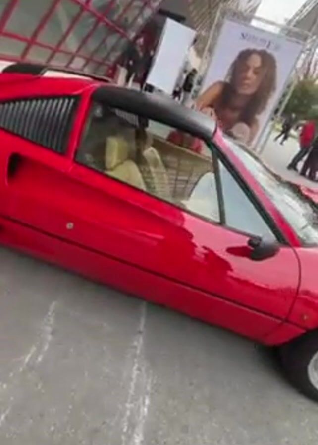 red Ferrari 308 GTS parked near an advertising poster for Selective