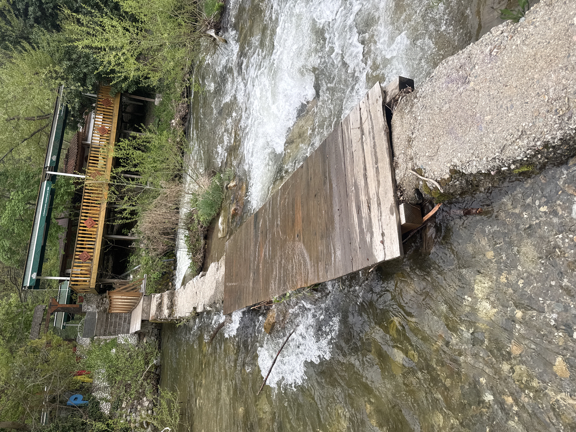 The image depicts a narrow wooden bridge spanning a river in Blagoevgrad, Bulgaria. The river appears fast-flowing and shallow, with visible rocks and pebbles under the water. The bridge is made of planks and connects to concrete structures on either side. On the left bank, there is a wooden structure, possibly a restaurant or cafe, with a railing and awning. Trees and vegetation surround the area. The scene is captured during daylight.