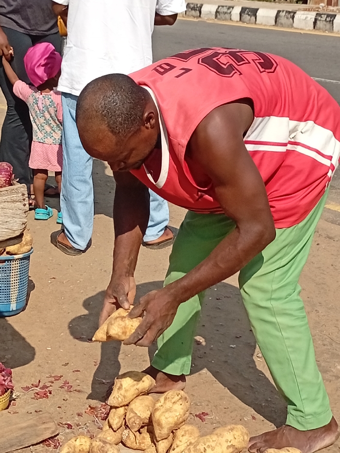 The scene depicts a street market activity in Adankolo, Nigeria, under clear daylight conditions. In the foreground, a dark-skinned adult male, wearing a red sleeveless shirt with "LE 91" printed on the back and light green trousers, is bent forward at the waist. He is barefoot and holding two pale-skinned root vegetables, consistent with yams or sweet potatoes, over a larger pile of similar produce arranged on the dirt ground. To the left of the produce pile, a blue plastic basket is partially visible, alongside scattered reddish-brown organic refuse on the ground. In the background, to the left of the primary subject, a young child in a pink patterned dress and a pink head covering stands, holding the hand of an adult whose dark lower garment is visible. Another adult, wearing a white shirt and light blue jeans, stands further back. A paved road with a black and white striped curb is visible in the distant background.