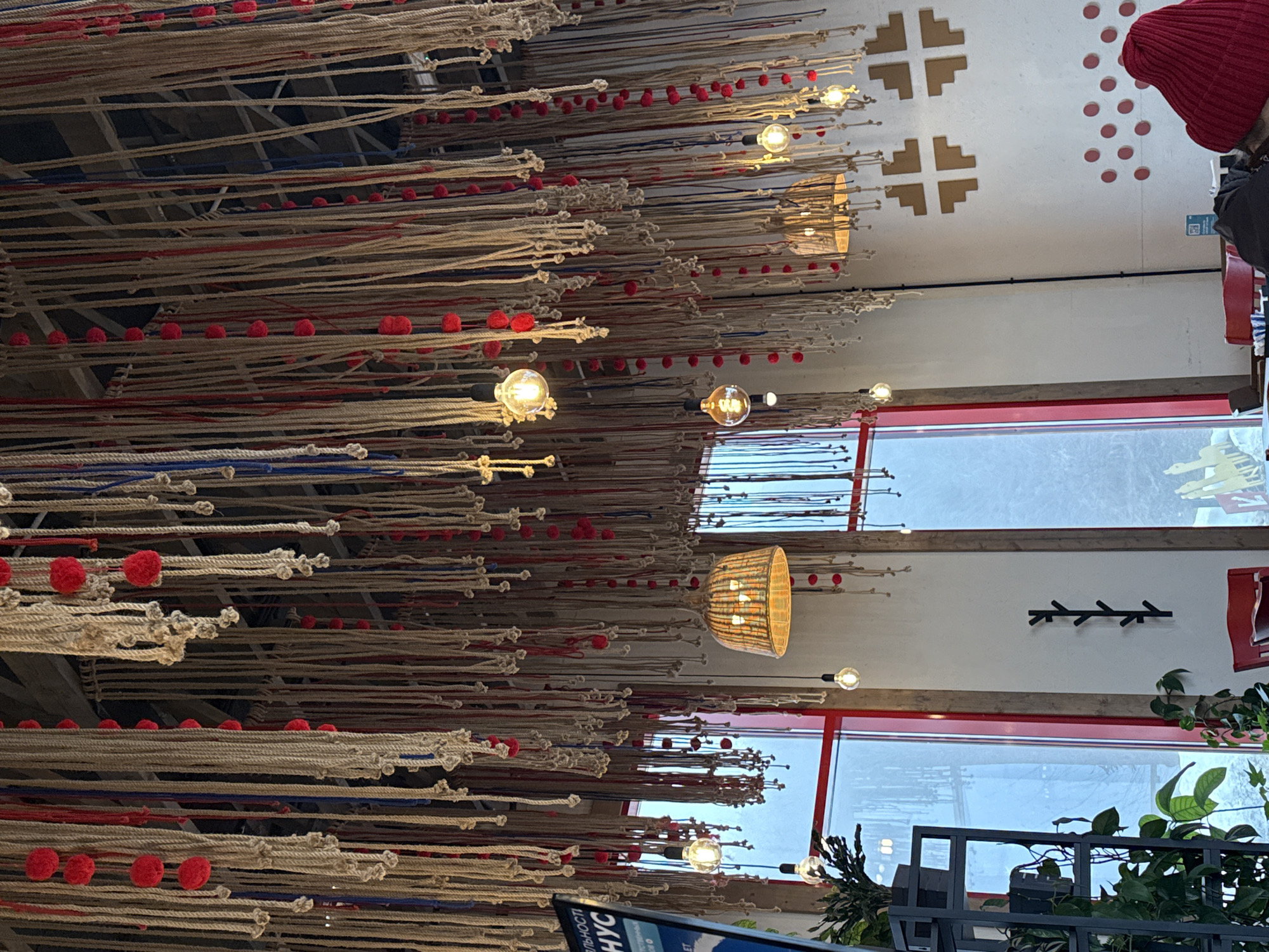 This image displays the interior of a commercial establishment, likely a restaurant or cafe, situated in Estosadok, Russia. The dominant feature is the ceiling, densely covered with numerous vertically hanging ropes of varying lengths, predominantly beige or off-white. Many of these ropes are adorned with small, red spherical pom-poms, and thinner strands of red and blue cord are interwoven. Multiple exposed filament light bulbs are suspended at different heights, some illuminated, providing a warm glow. At least two larger, woven basket-style pendant lamps are also part of the ceiling decor, one prominently positioned near the center. The walls are light-colored, possibly white, and feature large windows with red frames on the left and center-right, looking out onto an exterior covered in snow. Internal wooden beams frame these window sections. A black, branch-like coat rack is mounted on the wall between two windows. On the right wall, decorative elements include four light brown, geometric 'L'-shaped patterns arranged in a square formation, and below them, a horizontal row of red circular discs. In the lower-left quadrant, a black metal shelving unit holds several potted green plants. A digital display or menu board with partial Cyrillic text is visible on the far left wall. On the right side, the back of an individual wearing a red knitted hat is visible, seated at a table. Red chairs are partially discernible around seating areas. A small QR code sticker is affixed to a table surface. The scene is illuminated by a combination of natural light from the windows and artificial light fixtures.