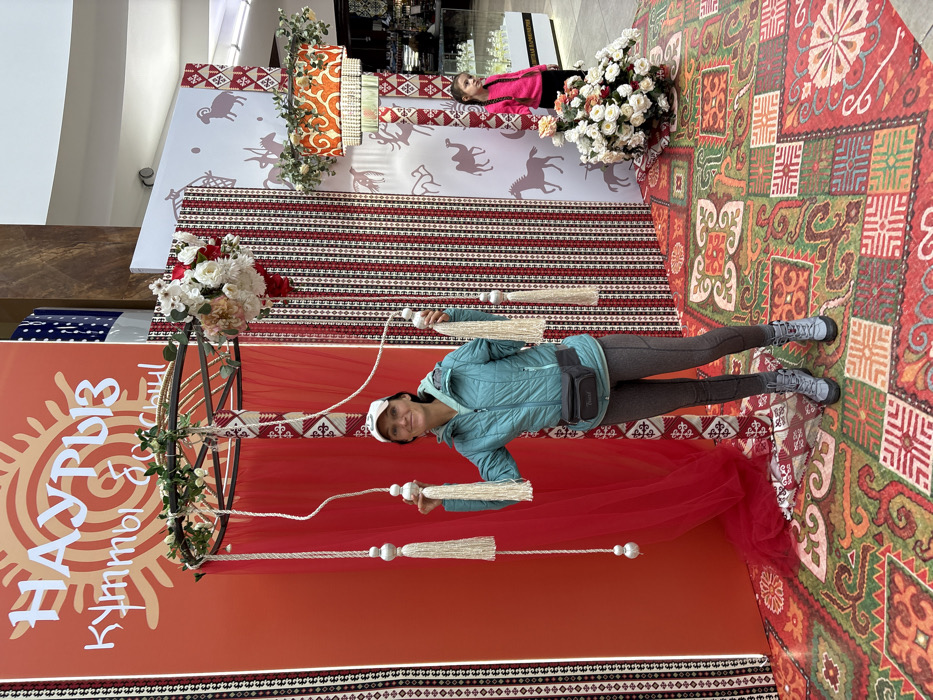 The image depicts an indoor cultural display, likely within a shopping mall in Petropavl, Kazakhstan, set up for a Nauryz celebration