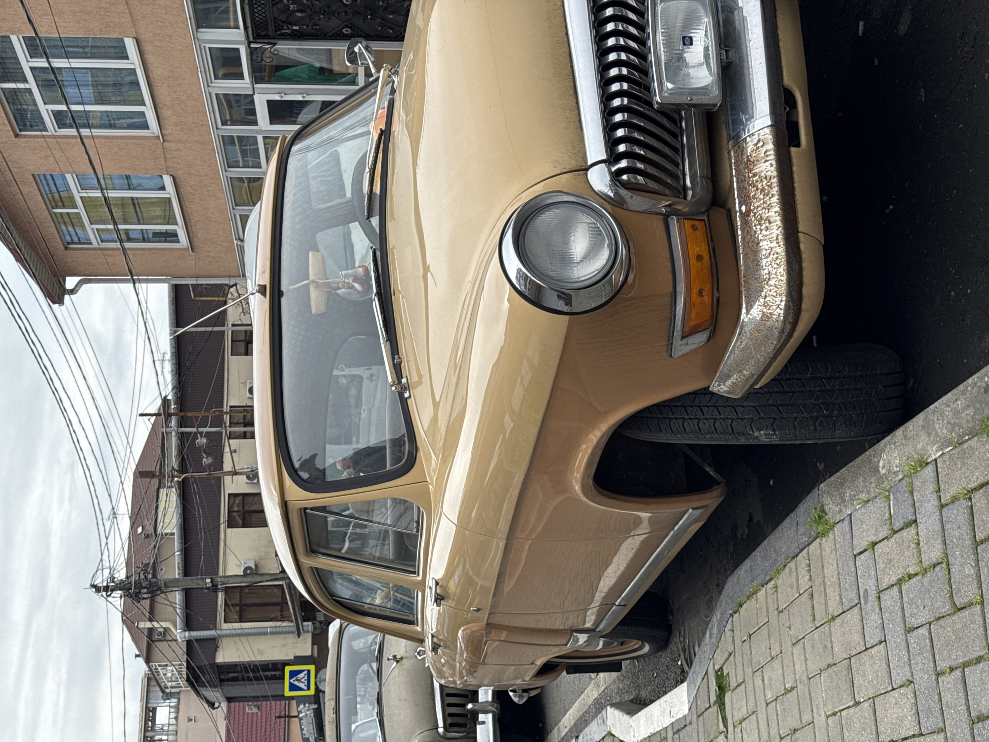 The image captures the front of a vintage beige car parked on a sidewalk in Sochi, Russia. The car is positioned closely to the curb. The car's grill, headlights, bumper, and part of the front tire are visible. The surrounding environment includes buildings with multiple windows, overhead wires, and a crosswalk sign. The day appears overcast.