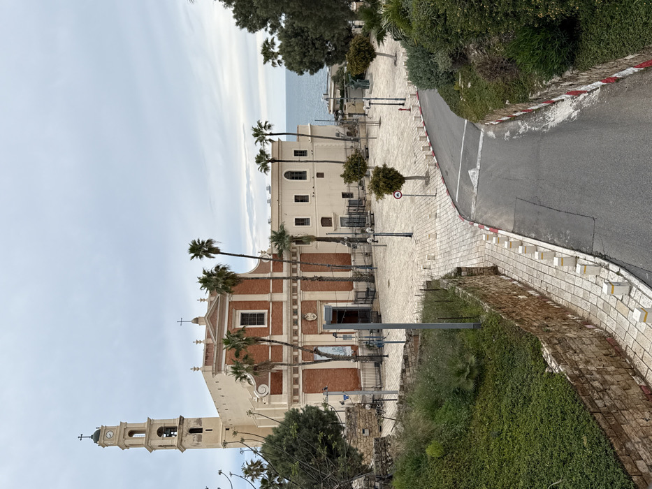 The image displays an elevated view of St. Peter's Church and Kedumim Square in Old Jaffa, Tel-Aviv, Israel, under an overcast sky. The central subject is the Baroque-style St. Peter's Church, constructed of light-colored stone and red brick, featuring a prominent bell tower with a visible clock and a cross at its peak. The church's facade includes pilasters, arched windows, and a central arched entrance. Several tall palm trees are positioned in front of the church. To the right of the church, an adjacent, lighter-colored building extends towards the Mediterranean Sea, visible as a calm, light grey-blue expanse. Kedumim Square, directly in front of the church, is paved with light-colored stone pavers and appears devoid of people. The square contains multiple streetlights, small cultivated trees, a circular "no entry" traffic sign, and a red fire hydrant. A dark statue is partially visible in the distance near the sea. In the foreground, an asphalt road slopes downwards towards the square, marked with a white directional arrow and bordered by red-and-white striped curbings. To the left of the road, a pedestrian walkway of light-colored tiles is demarcated by white and yellow bollards, alongside an ancient stone retaining wall supporting a densely vegetated slope. A similar green, vegetated slope borders the right side of the road. No individuals or active subjects are present in the scene.