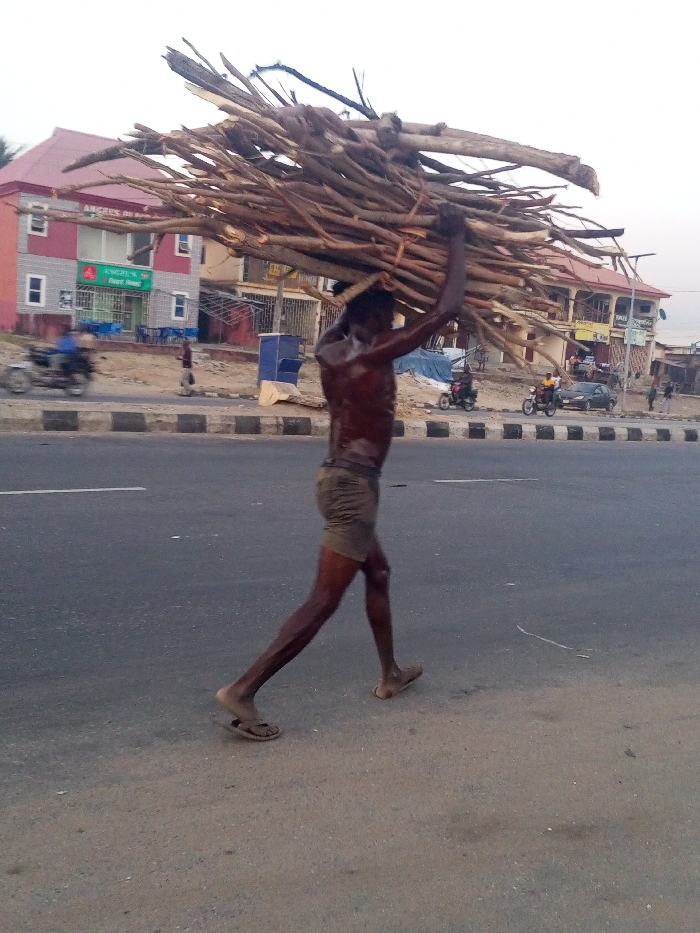 A dark-skinned man is carrying a large bundle of sticks or wood on his head, walking along a road. He is shirtless, wearing short khaki-colored pants and sandals. In the background, there are buildings, including one with the sign "ANGEL'S REST FOOD." Motorcycles and cars are moving on the road, and there are a few other people visible in the distance. The photo appears to be taken during the day.