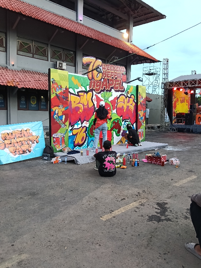 An outdoor scene in Margorejo, Indonesia, depicts a graffiti art event taking place on asphalt pavement in front of a large building and a temporary stage. Three individuals are actively engaged with a tall, multi-panel graffiti wall displaying colorful street art. In the center, a person wearing a white cap, dark top, and blue jeans stands, spraying paint onto the wall. To their right, a second person, clad in a black top and dark pants, crouches and also applies paint. A third individual is seated on the pavement in the foreground, facing away from the viewer, wearing a black t-shirt with a pink graphic on the back. A fourth person's lower legs and feet are partially visible in the far right foreground. The graffiti wall itself features vibrant, cartoon-style elements, including bold lettering, various characters, and a prominent banner across the top reading "76 WEEKEND HEPPIII NGAPEL." Numerous spray paint cans of various colors are scattered on the ground directly in front of the wall, many placed on a grey mat. A black "VANS" backpack and a light blue banner with graffiti text lie on the pavement to the left of the main wall. In the background, a multi-story building with a red tiled roof and grey walls features windows with dark frames and visible air conditioning units. To the far right, a temporary stage structure with lighting rigs and an illuminated screen is set up, indicating an ongoing or upcoming event. Metal scaffolding is also visible near the stage. The sky is light and overcast, suggesting late afternoon or early evening. The ground is asphalt with faint yellow line markings.