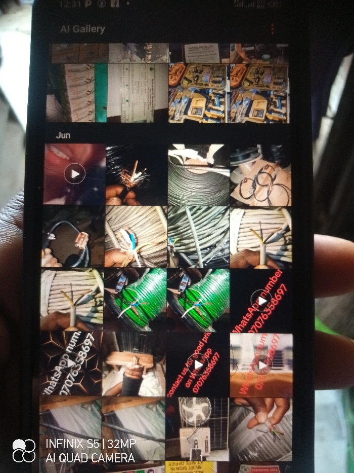 A black INFINIX S5 smartphone, bearing the "32MP AI QUAD CAMERA" inscription, is held by a hand with dark skin, visible on the lower left. The phone's screen displays an "AI Gallery" interface, featuring a grid of 28 thumbnail images and several active video play icons. The top row of thumbnails includes images of stacked items, possibly documents or currency, electronic circuit boards, and yellow power tools with accessory kits. Below a section labeled "Jun," the majority of thumbnails depict electrical wiring tasks, including spools of black, grey, and green insulated cables, stripped wires, and hands connecting electrical components. Several thumbnails overlay promotional text, such as "WhatsApp number 070763558697" and "contact us for good price on WhatsApp 070763558697." One distinct thumbnail shows a solar panel unit with a small fan. The phone's status bar at the top displays "12:31 P." The environment surrounding the phone is out of focus, showing indistinct shapes and colors. The location is Unknown, Unknown.