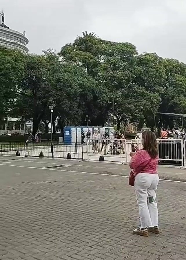 small crowd gathering around a temporary stage set up in a paved public square. The stage is black and appears to be the back of a trailer, with a band setting up on it. The backdrop of the scene includes a building with a rounded corner and a large number of trees. A series of portable toilets are set up behind a metal barrier. Several people are standing and watching the band prepare, while others are taking photos. A sign on the side of the stage reads "Secretaría de Cultura." The overall atmosphere is casual and suggests an outdoor performance or event is about to begin. The sky is overcast.