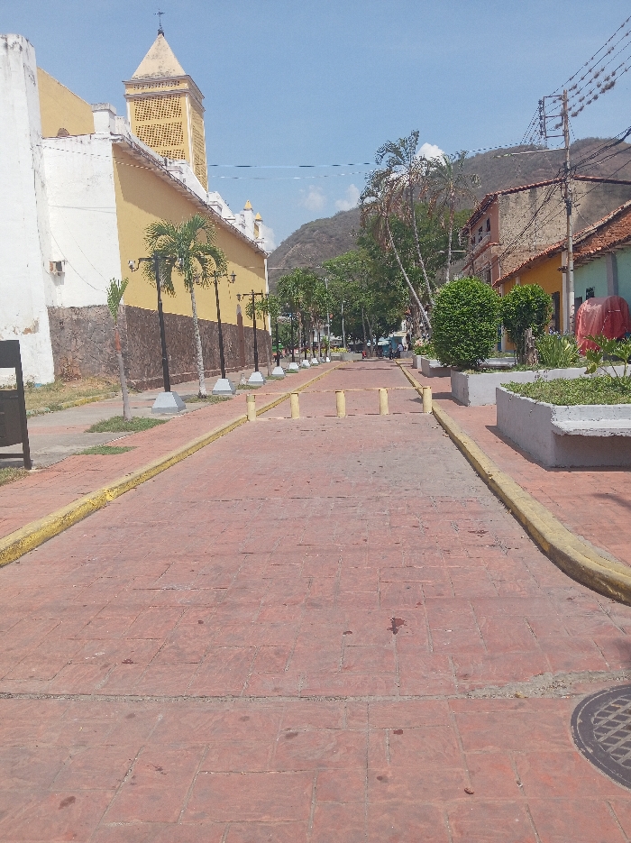 A brick street leads the eye toward a distant mountain. The street's path is lined with palms and streetlights on the left, and trees with landscaped benches on the right. A church, painted yellow and white, dominates the left side of the street. Houses line the right side, their rooftops terracotta-colored. Small, yellow posts intermittently block the path of vehicles on the brick street.