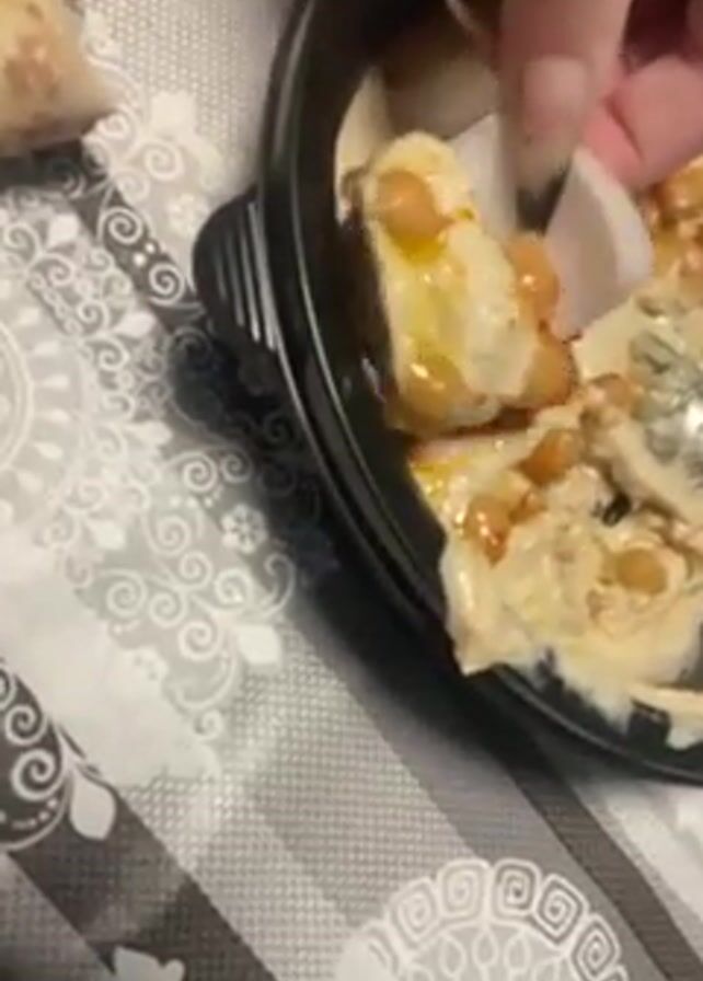woman eating food at a table. The woman is wearing glasses, a beige tank top, several necklaces, and many rings and bracelets. She picks up a white item from a bowl of hummus topped with chickpeas and red spices, puts it in her mouth, and chews. Next to the bowl is some bread. The table has a grey and white striped tablecloth with a geometric pattern. In the background, through a glass door, is a room with clothes hanging on a rack.