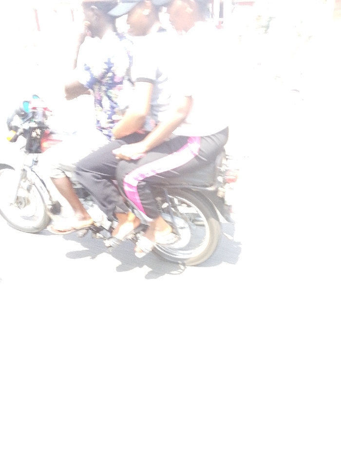 Three individuals are riding on a motorcycle. The driver wears a patterned shirt and dark pants, followed by a passenger in a grey shirt and black pants. The final passenger is wearing a white shirt and black track pants with a pink stripe. The motorcycle is moving, blurring the scene. The background is heavily overexposed, making it difficult to discern any details beyond the motorcycle and its riders. All three individuals are wearing light colored footwear.