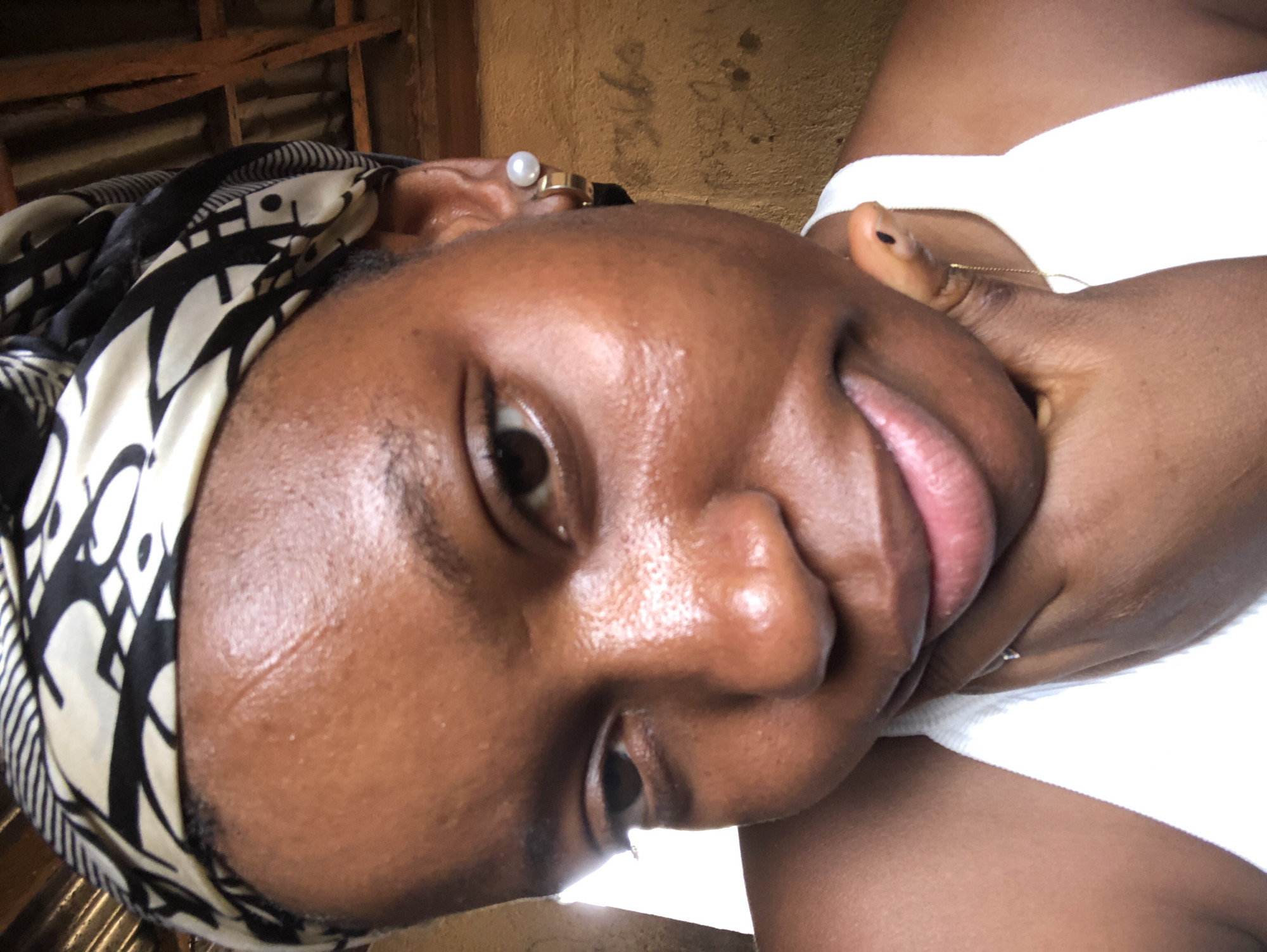 A close-up, chest-up portrait features an individual with a dark skin tone and a moisturized complexion. The person wears a black and white patterned headwrap, a white sleeveless garment, and is seen with their left hand (viewer's right) supporting their chin. A subtle smile is present, and their brown eyes are cast downwards. The right ear (viewer's left) displays a gold hoop earring and a white pearl stud. A thin gold chain is visible around the neck area. The background consists of an earthen-toned, textured wall with faint, white, indecipherable markings or graffiti on the right side. Above, exposed wooden ceiling joists or rafters are visible, alongside what appears to be corrugated metal roofing. A bright, white light source is present to the subject's left (viewer's right). This scene is located in Jos, Nigeria.