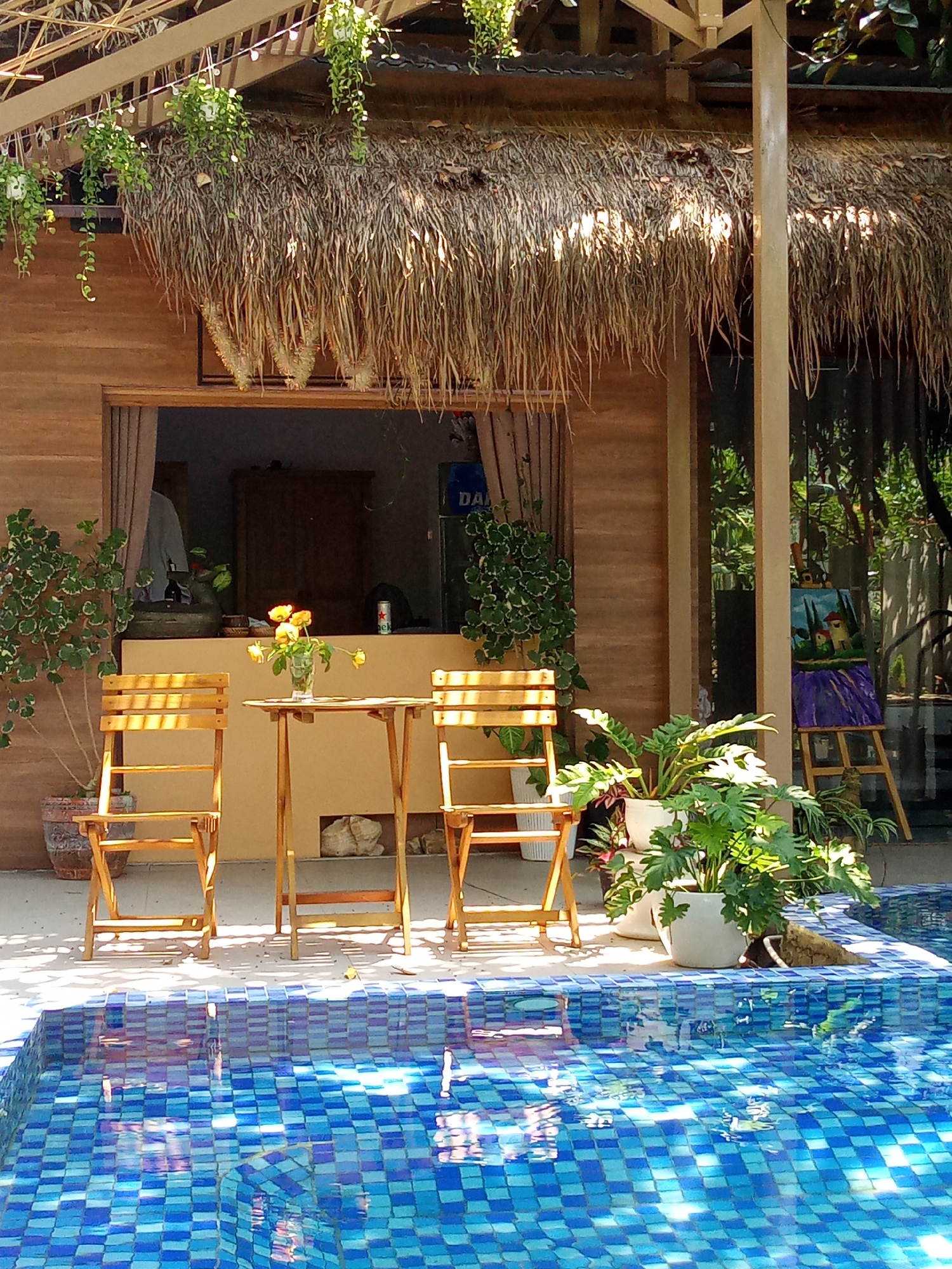 tranquil poolside setting in what appears to be Bac Natural Heritage Area Trang, Vietnam. Two wooden chairs and a small table sit on a patio adjacent to a swimming pool with blue tile. A vase of yellow flowers adorns the table. Various potted plants decorate the scene, adding to the tropical ambiance. The backdrop features a building with a thatched roof, suggesting a resort or guesthouse. An easel with a painting of a landscape is partially visible behind some plants.