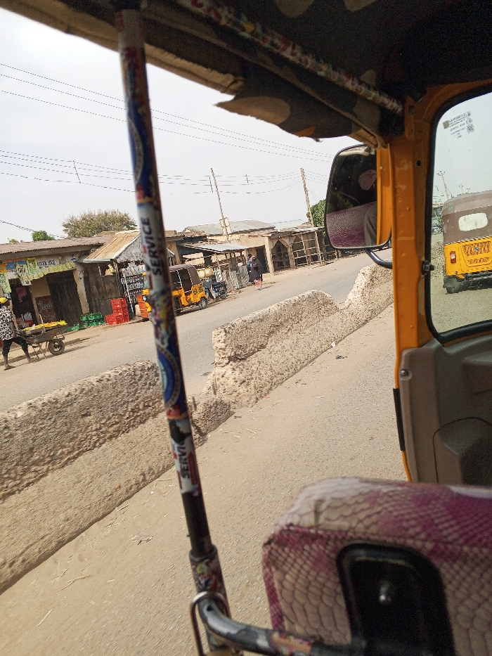 The image depicts a street scene in Dakata, Nigeria, observed from inside a yellow motorized rickshaw