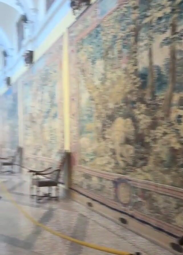 The video pans across a long hall in a museum. The hall has a high, ornately decorated, vaulted ceiling and a polished, tiled floor. Sunlight enters through tall windows on the left side of the hall, and ornate light fixtures are visible on the ceiling. Large tapestries adorn the walls on the right side of the hall, interspersed with framed paintings and decorative furniture. A yellow rope barrier runs along the floor, separating visitors from the art. Several people are walking through the hall, including a man in a black jacket and a woman in white pants. They are walking towards the end of the hall, where a doorway leads to another room.
