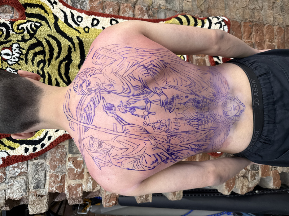 A person is lying on their side on a brick surface. They have a large tattoo in blue ink covering their back. The tattoo depicts what appear to be religious figures including an angel holding scales, the grim reaper, and other various religious images. The person is wearing dark colored pants and a pair of underwear that say “LO ASSN”. A rug is partially visible with a tiger print design.